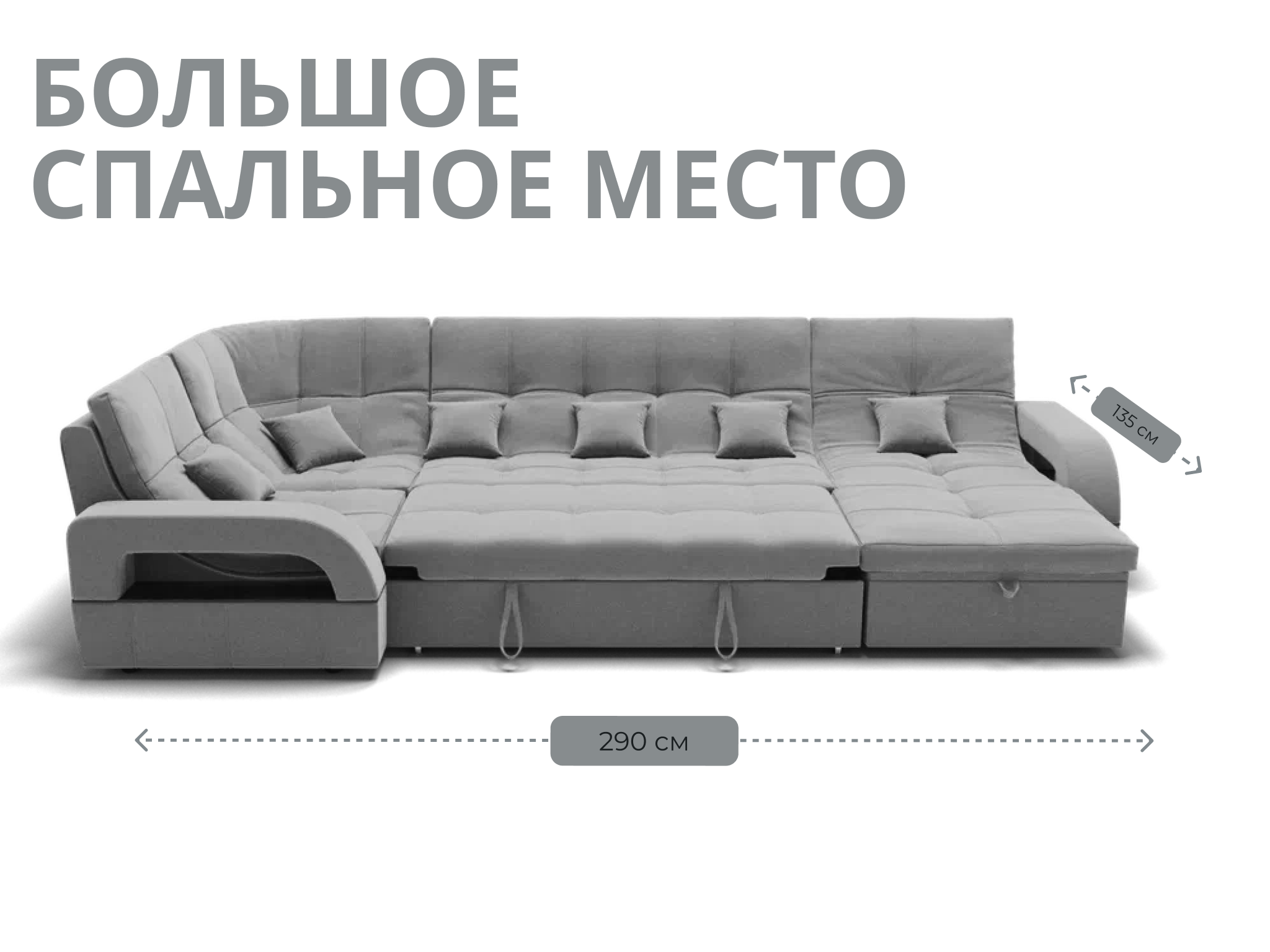Спальное место имеет ширину 135 см и длину 290 см. Он предназначен для двух человек и имеет глубину сиденья 65 см. Максимальная нагрузка на диван составляет 280 кг.