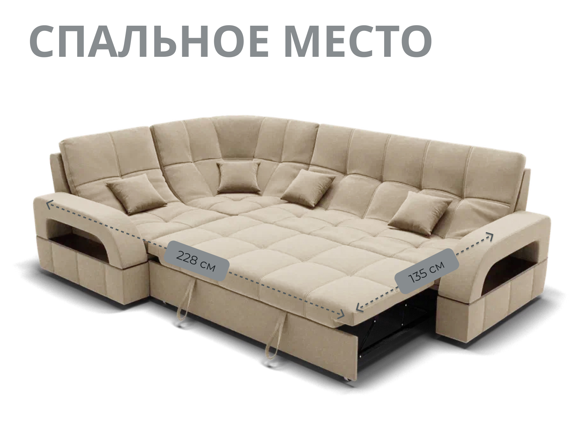 Спальное место имеет ширину 135 см и длину 211 см. Он предназначен для двух человек и имеет глубину сиденья 65 см. Максимальная нагрузка на диван составляет 280 кг.