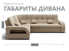 Он имеет высоту 97 см, ширину 187 см и глубину 268 см. Диван обладает универсальным расположением угла, что позволяет его использовать в любом помещении.