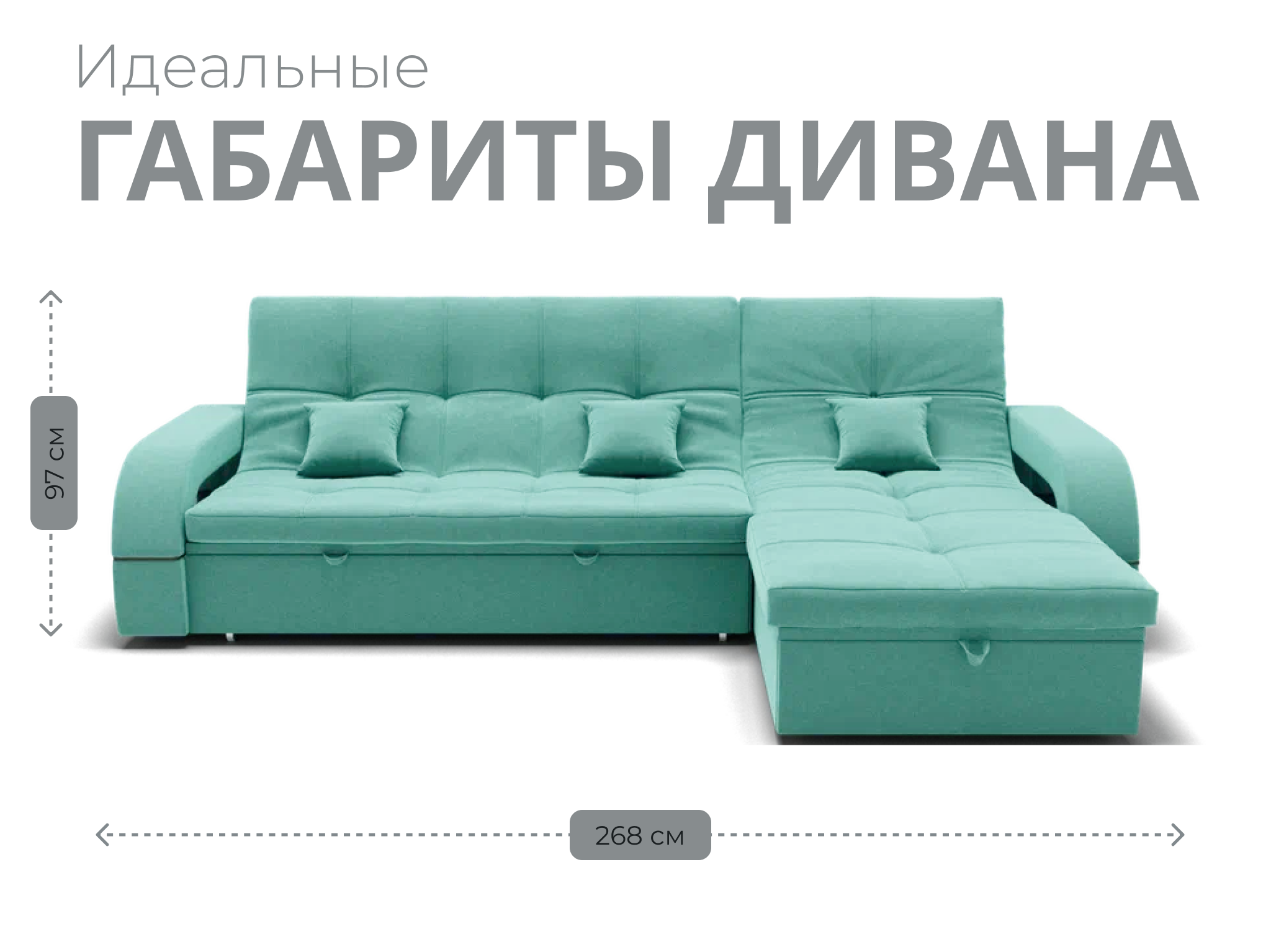 Он имеет высоту 97 см, ширину 268 см и глубину 175 см. Диван обладает универсальным расположением угла, что позволяет его использовать в любом помещении.