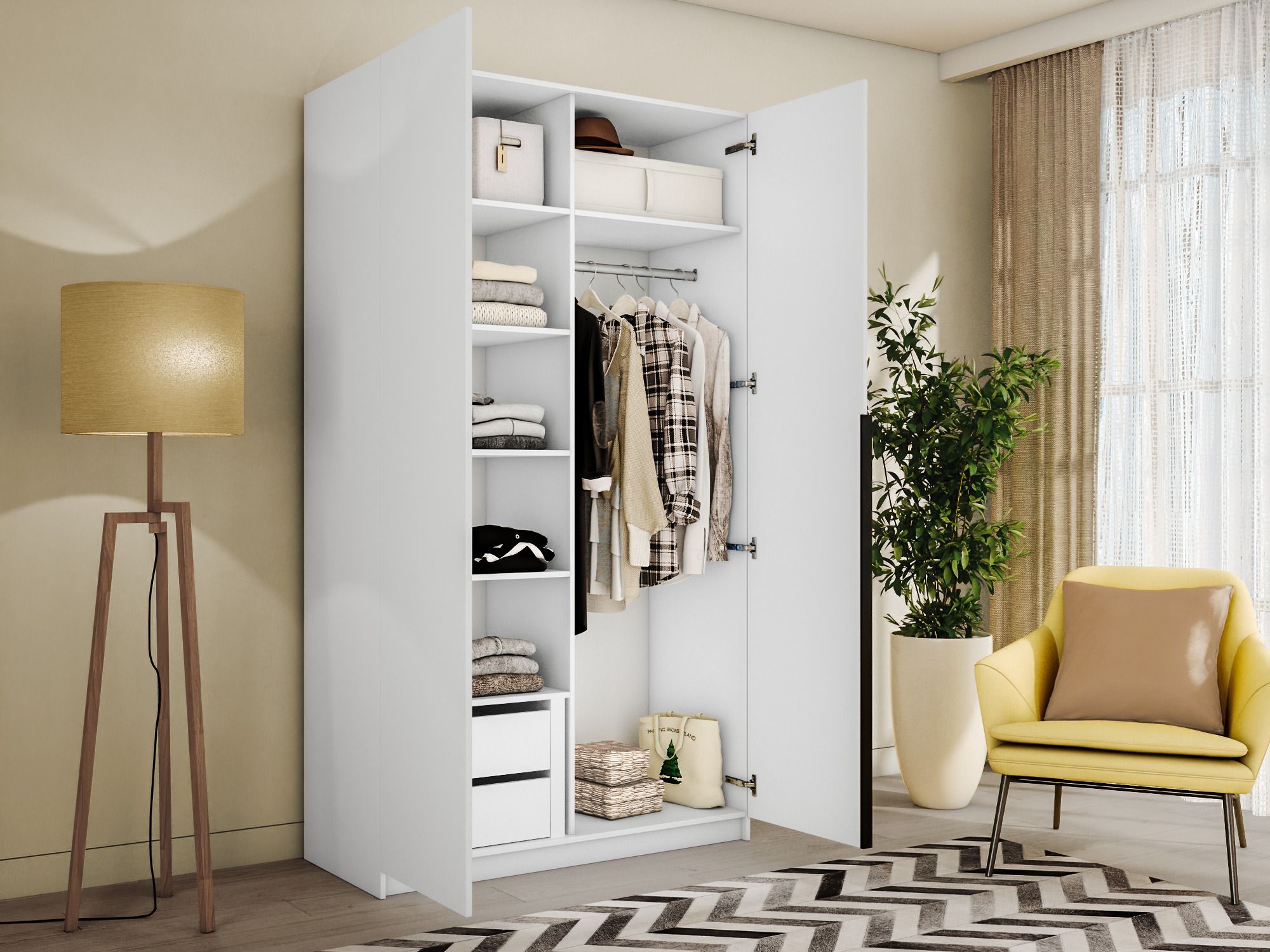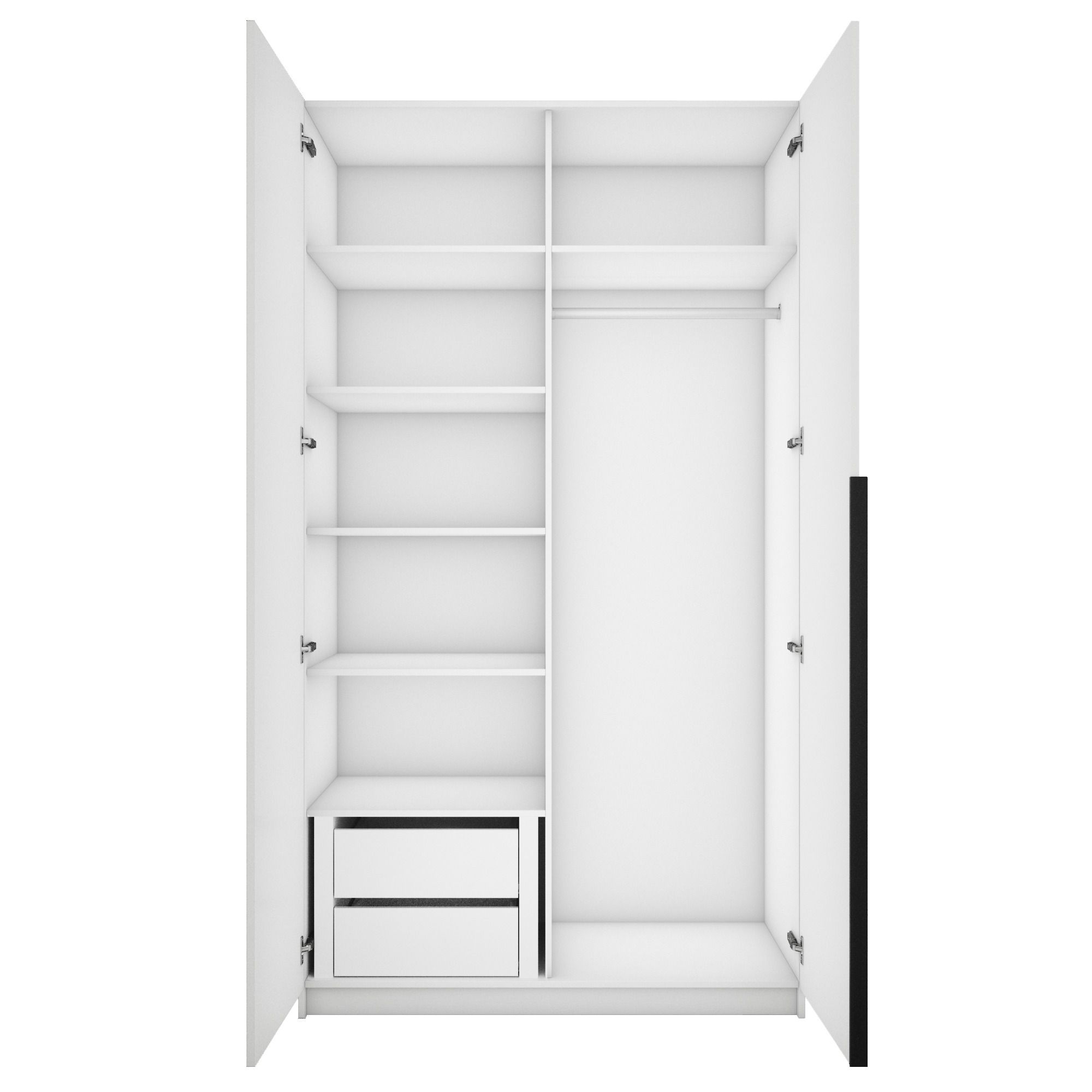 Благодаря надежным полкодержателям - штифтам, полки шкафа могут выдерживать до 15 кг, штанга выдерживает нагрузку до 60 кг. Вы сможете убрать сезонные вещи, постельное белье на верхние полки. Распашной шкаф оснащен долговечной, ударостойкой кромкой ПВХ, которая защищает его торцы от сколов и повреждений, что обеспечит вам комфортное и долгое использование гардероба. Распашная система дверей Titus B-Type обеспечивает надежное прилегание дверцы к корпусу шкафа и высокую износостойкость. Механизм не деформируется при значительных нагрузках и максимально практичен в эксплуатации. Шкаф оснащен удобной минималистичной ручкой, изготовленной из алюминия. В производстве используется безопасное ЛДСП международного класса Е1, что способствует безопасному использованию на протяжении всего срока эксплуатации.