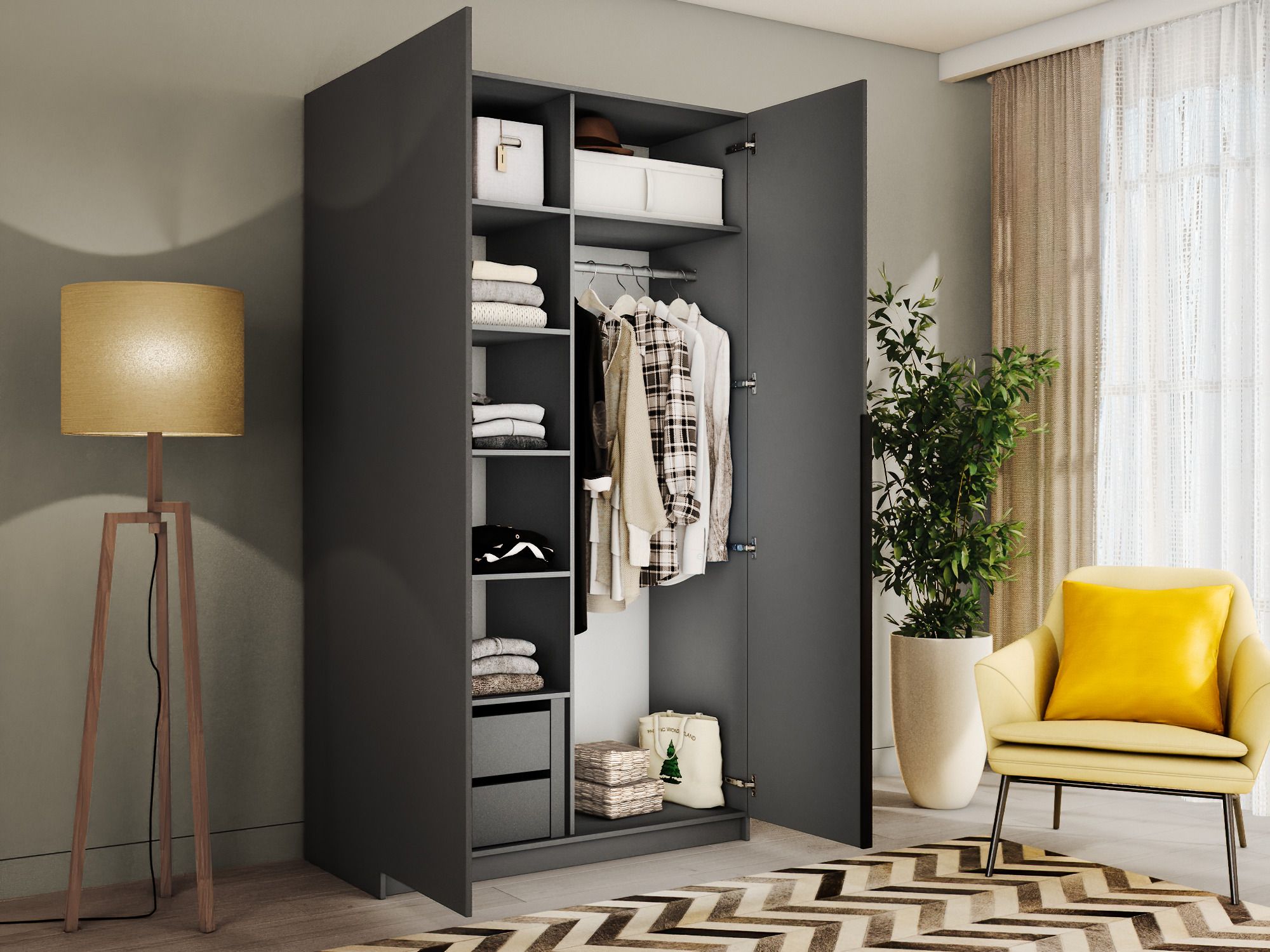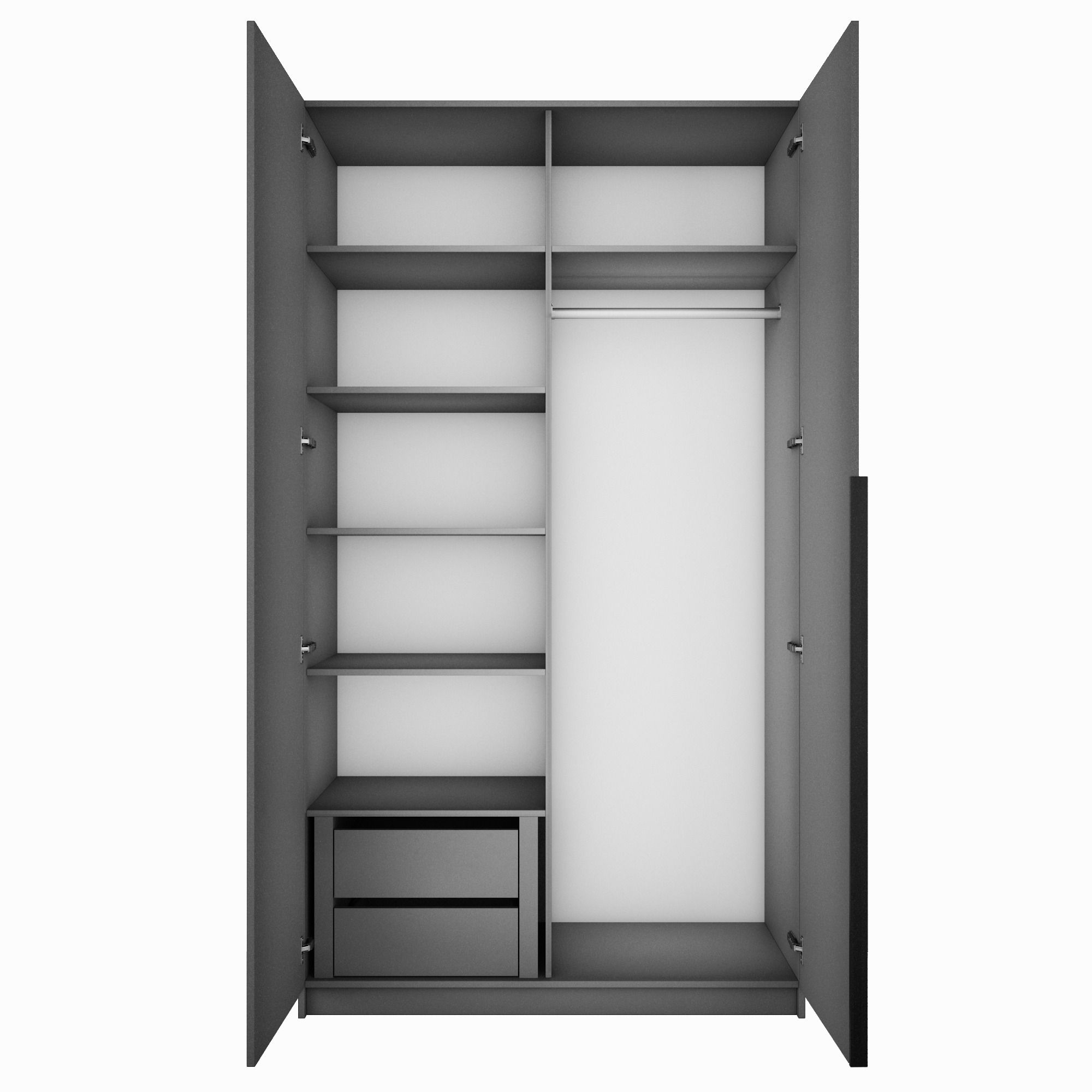 Благодаря надежным полкодержателям - штифтам, полки шкафа могут выдерживать до 15 кг, штанга выдерживает нагрузку до 60 кг. Вы сможете убрать сезонные вещи, постельное белье на верхние полки. Распашной шкаф оснащен долговечной, ударостойкой кромкой ПВХ, которая защищает его торцы от сколов и повреждений, что обеспечит вам комфортное и долгое использование гардероба. Распашная система дверей Titus B-Type обеспечивает надежное прилегание дверцы к корпусу шкафа и высокую износостойкость. Механизм не деформируется при значительных нагрузках и максимально практичен в эксплуатации. Шкаф оснащен удобной минималистичной ручкой, изготовленной из алюминия. В производстве используется безопасное ЛДСП международного класса Е1, что способствует безопасному использованию на протяжении всего срока эксплуатации.