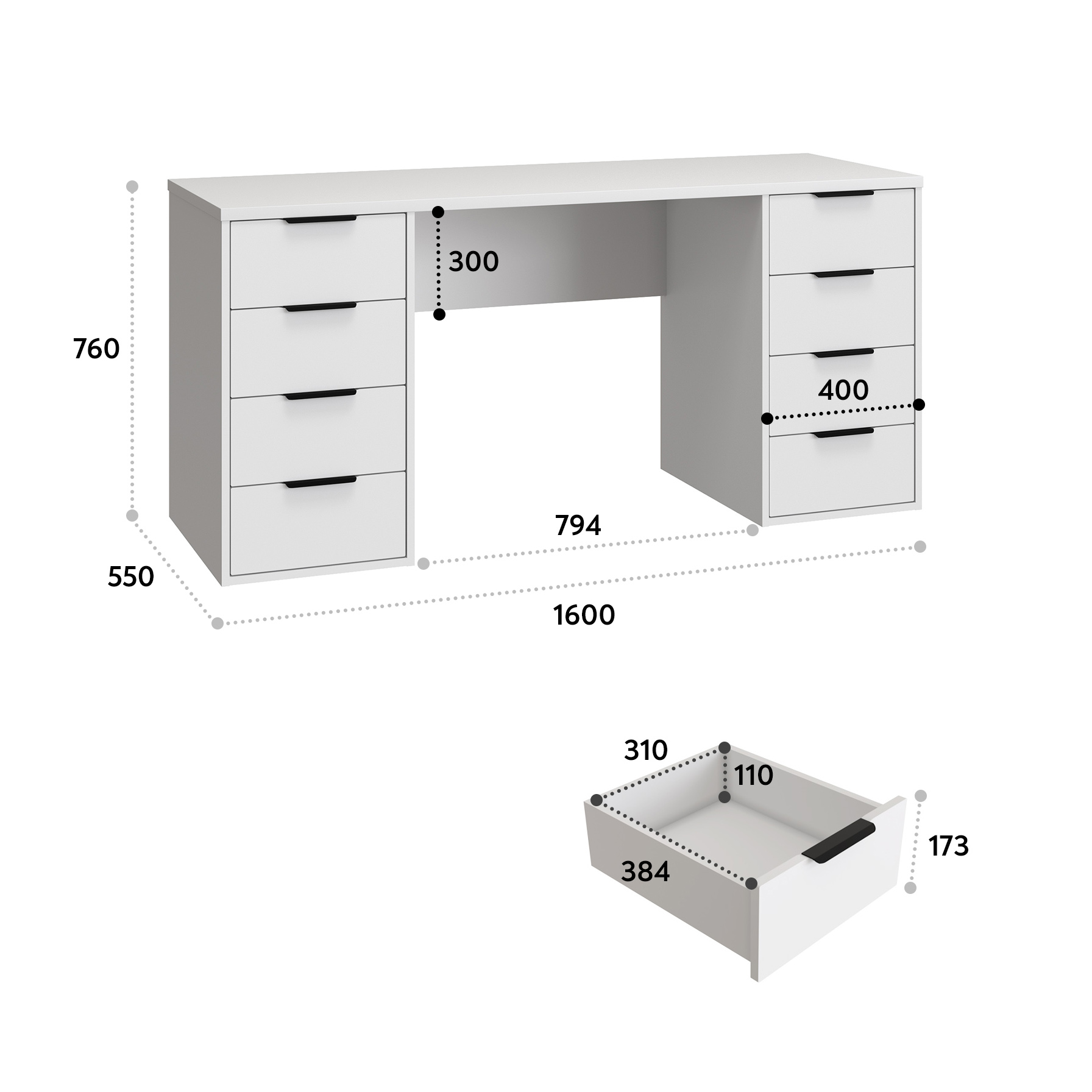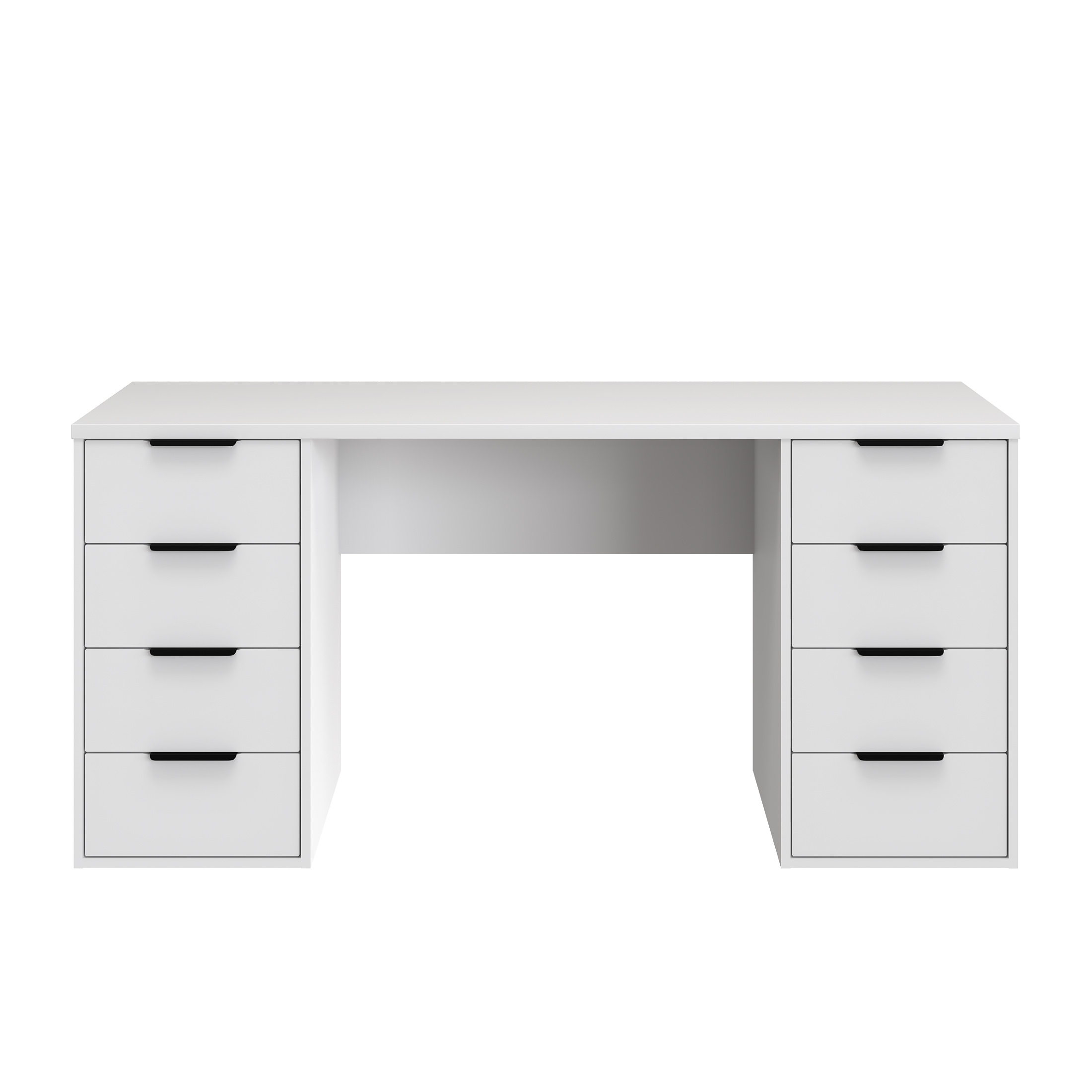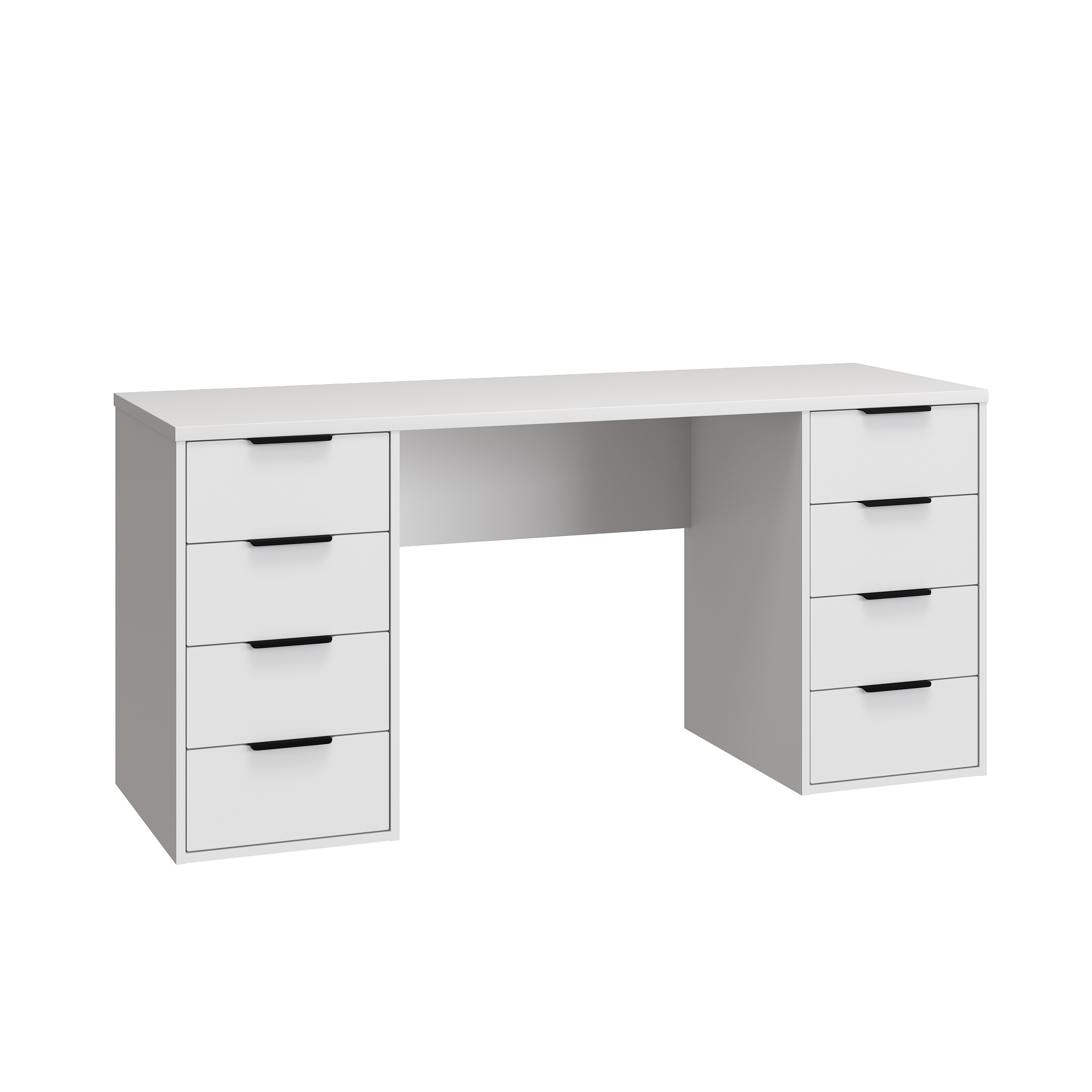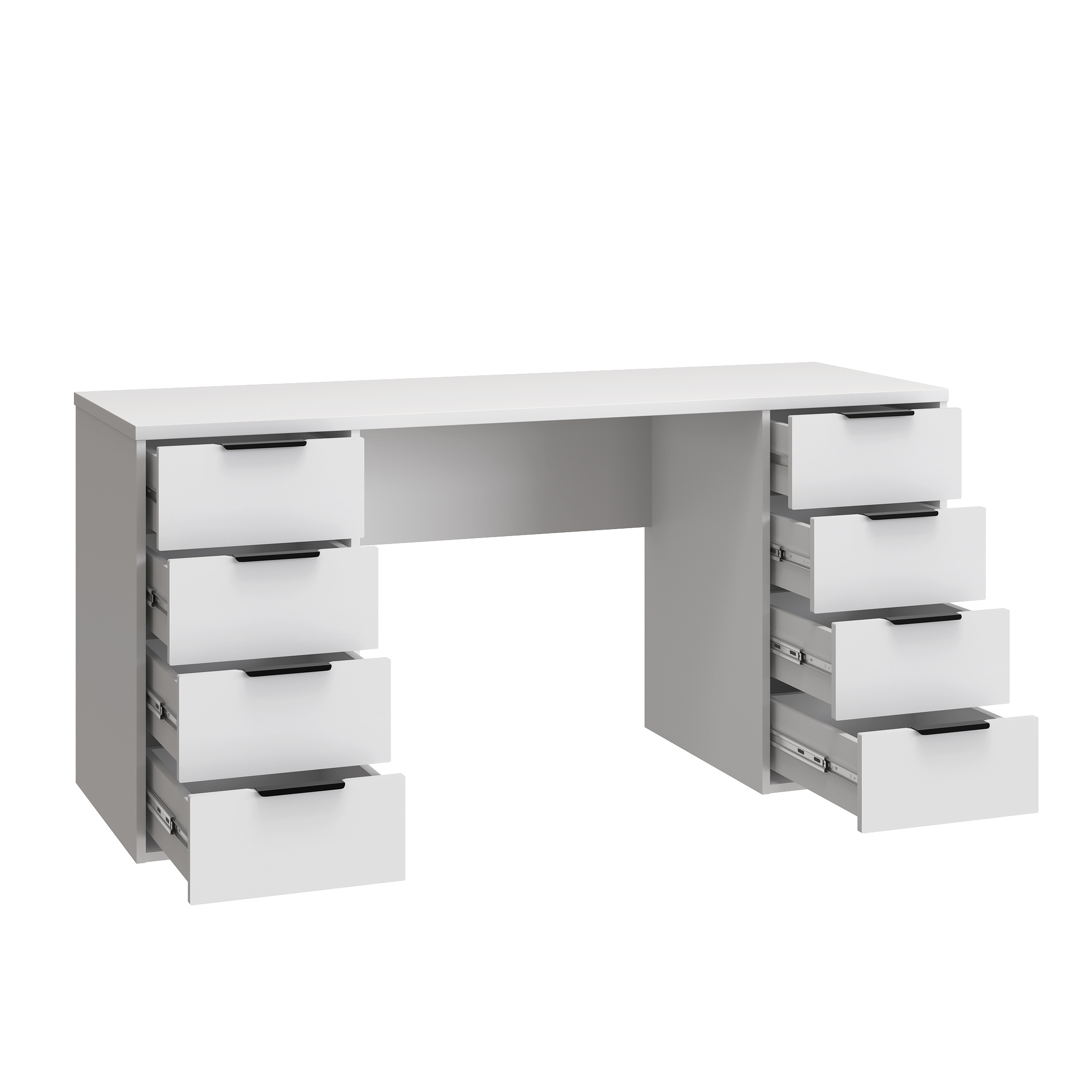 Стол компьютерный, письменный С-403 - это идеальное решение как для большого пространства, так и для небольшой комнаты. Стол прямой обеспечивает максимальную вместительность и удобство использования. Справа и слева располагаются тумбы с четырьмя выдвижными ящиками, вместительными и комфортными в расположении. Не нужно никуда вставать, за важными документами или вещами, достаточно расположить все рядом с собой! Столешница изготовлена из ЛДСП 25 мм, фасады МДФ 16 мм. Дно ящика двп 3 мм. Фурнитура: ручки металл, телескопические направляющие полного выдвижения без доводчиков.