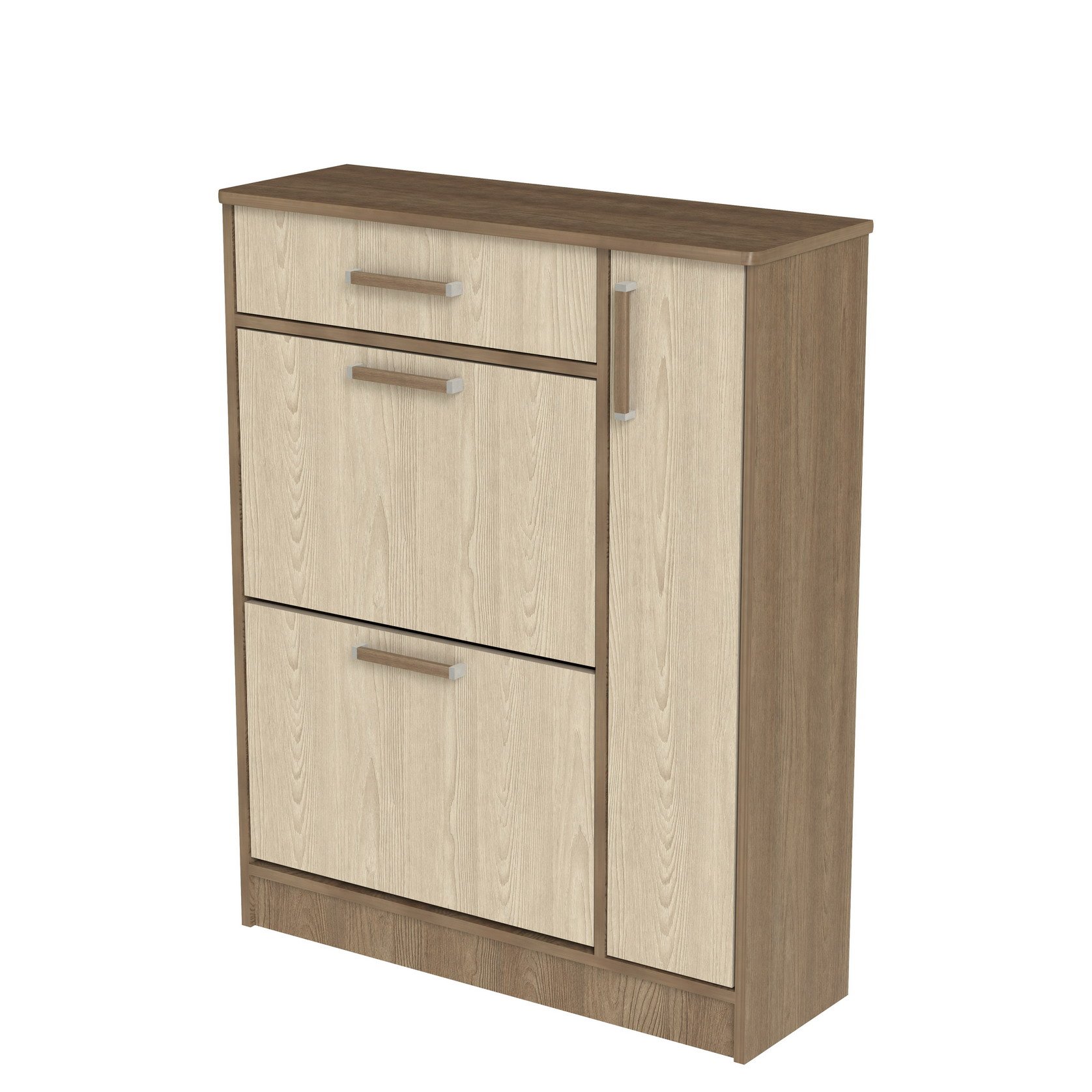 Обувница с двумя откидными нишами под обувь, распашной дверью со съемными полками и выдвижным ящиком. Тумба идеально встанет в Вашей прихожей и не займет много места.Корпус и фасады из качественного ЛДС.Производитель оставляет за собой право менять фурнитуру.