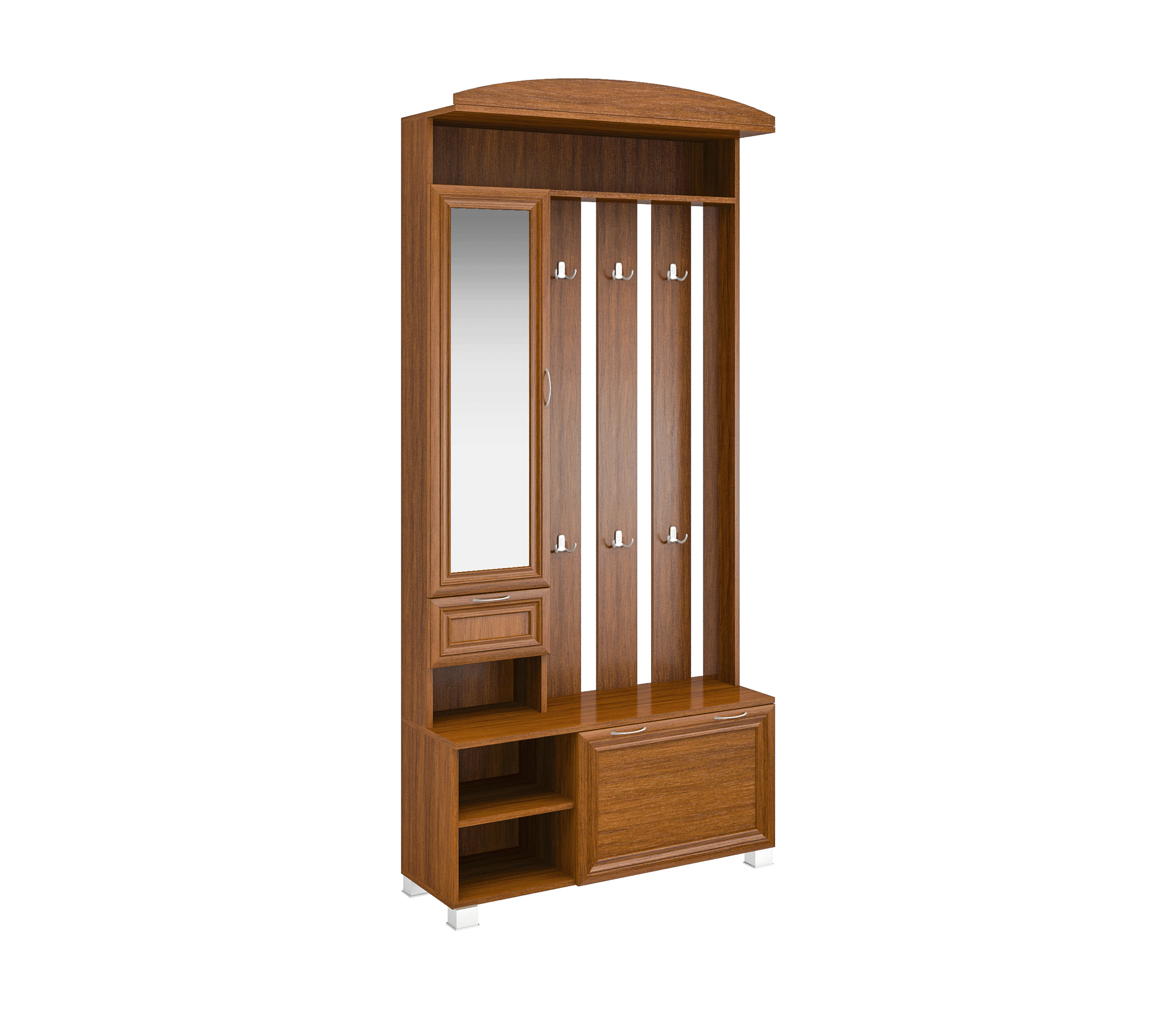 Корпус прихожей выполнен из Ламинированной ДСП высшего качества с насыщенным цветом. Фасады выполнены из материала МДФ и дополнительно укреплены металлическими скобами и силиконом изнутри. Шириною 95 см., данная прихожая похожа на седьмую модель, только без шкафа, разработана специально для тех кому он не нужен. Имеется узкое зеркало над ящиком, а снизу секция за откидной дверцей. Так же есть 5 двойных крючков на вешалке, как и на других моделях. Модель идеально подходит как для не больших помещений.