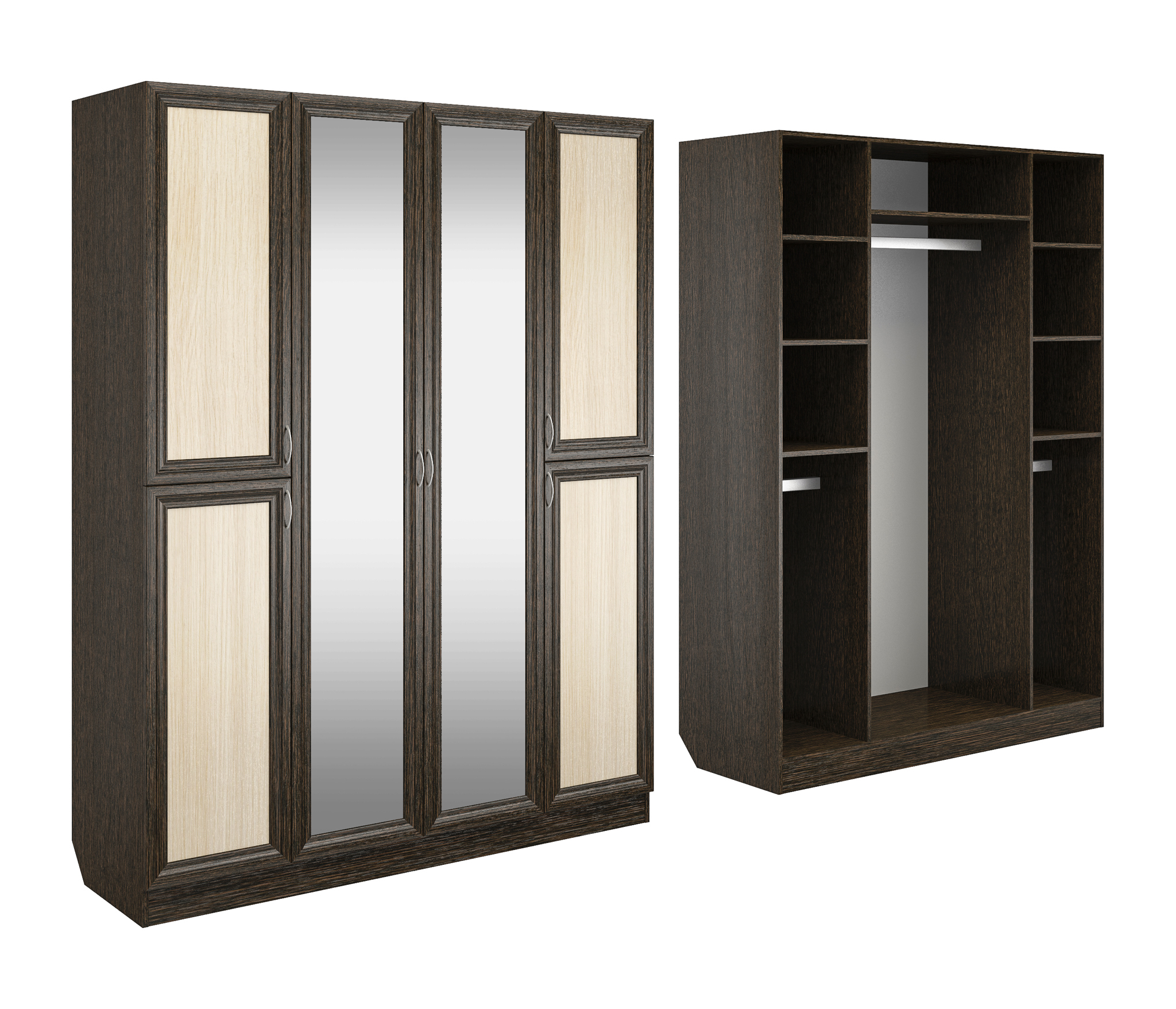 Корпус шкафа выполнен из Ламинированной ДСП высокого качества с насыщенным цветом. Фасады выполнены из материала МДФ.В данной моделе используются зеркала, которые внедрены в рамки фасадов.Шириною 160 см., красивый и большой четырехстворчатый шкаф. В центре 2 большие створки с зеркалами, за ними расположено большое отделение со штангой. Симметрично расположенные крайние отделения закрываются на верхние и нижние распашные двери. Вверху у каждого по три ниши, внизу по штанге. Два зеркала в данной моделе уже включены в стоимость.