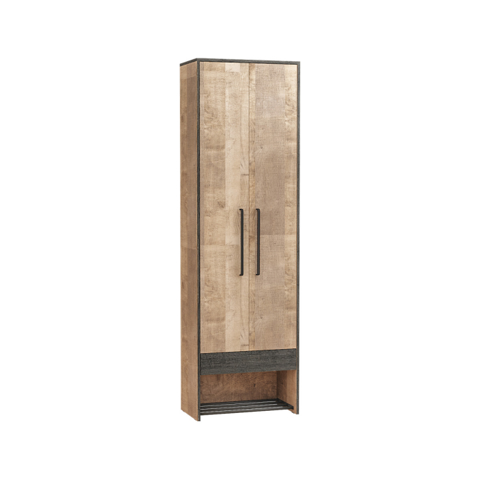 Распашной двухдверный шкаф с открытой полкой для обуви, выдвижным ящиком и выдвижной штангой, выполненный в стиле лофт.