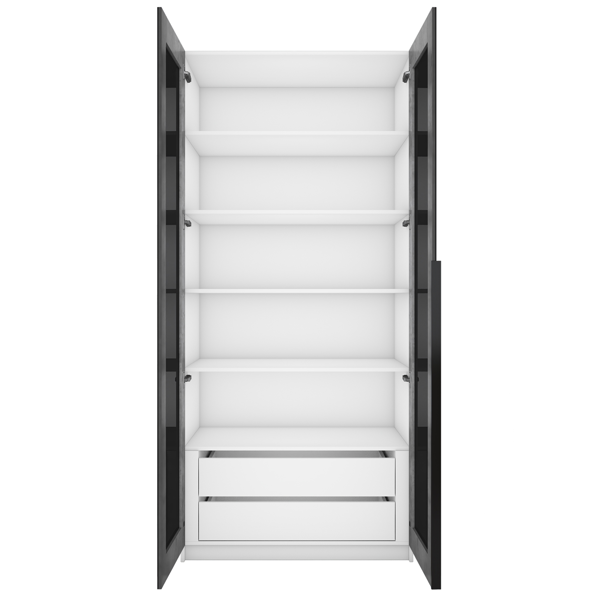 Фасады шкафа изготовлены из стекла черного цвета, оклеенного противоосколочной пленкой с внутренней рамкой из ЛДСП Бетон.
