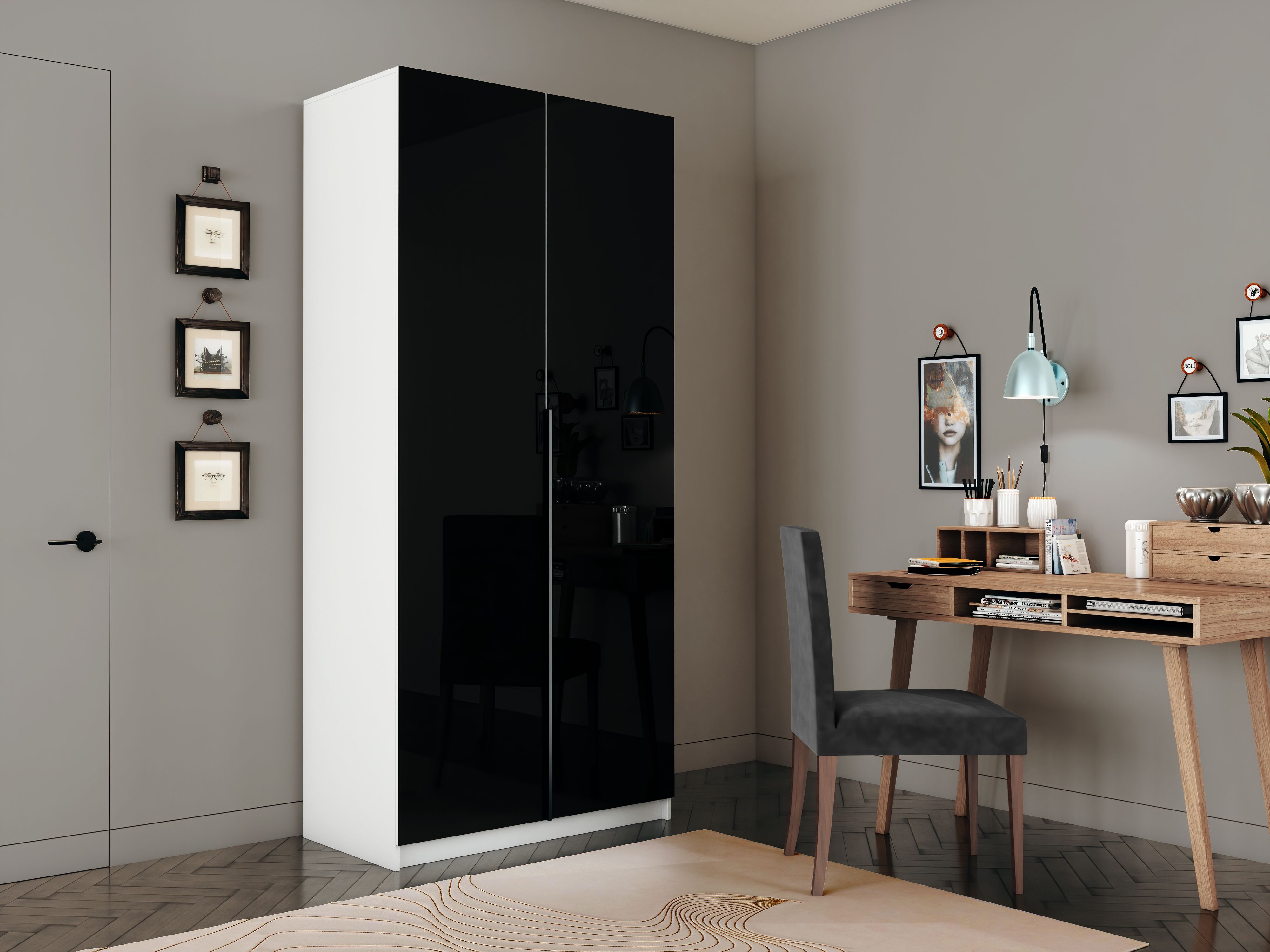 Шкаф оснащен удобной минималистичной ручкой, изготовленной из алюминия.