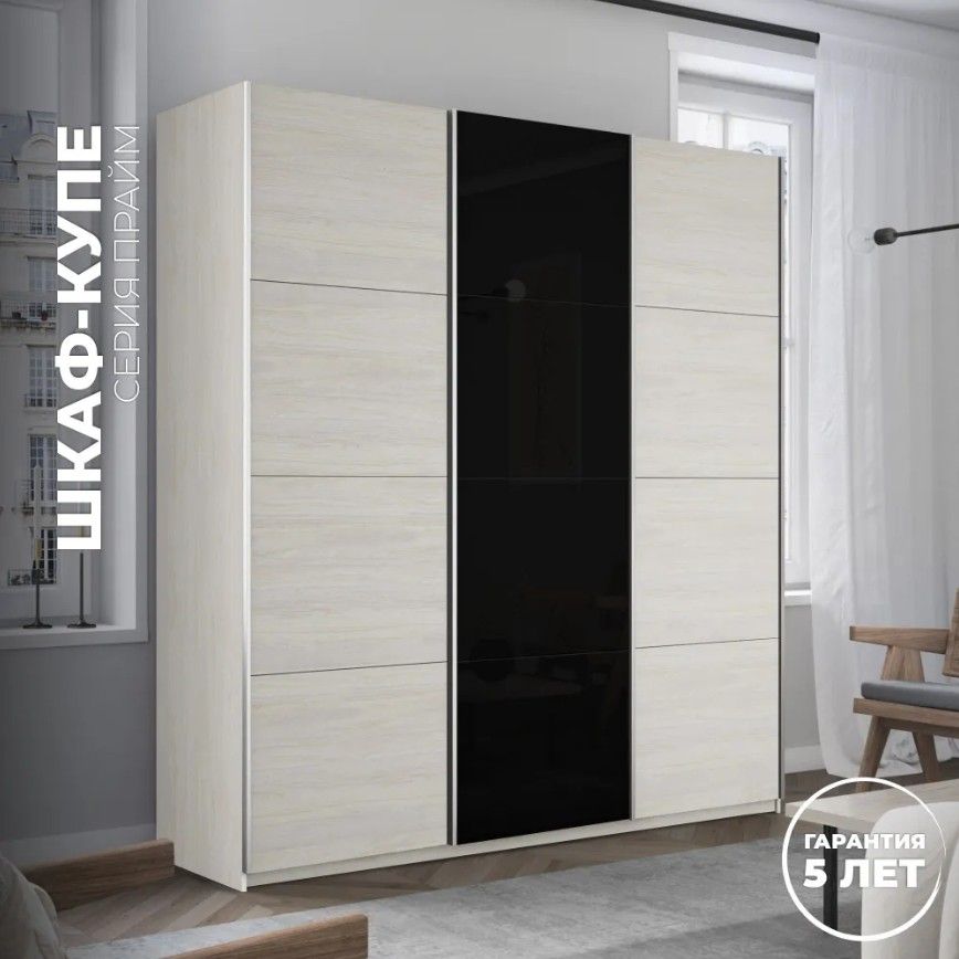 Отзывы о Столплит Шкаф-купе Прайм 3-х дверный ДСП/Стекло черное/Доводчики 180х57х230 Ясень Анкор светлый