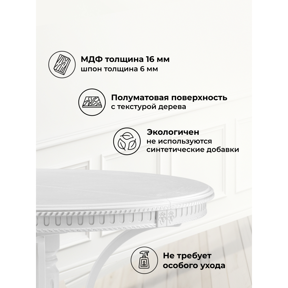 Форма столешницы: овальная — такая форма способствует более комфортному общению и создает ощущение простора.