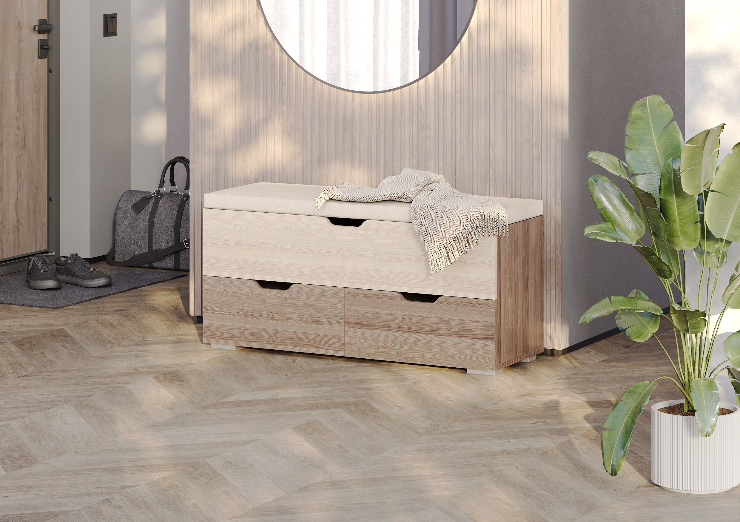Диван для прихожей "Флинт" стилизован под сундук с мягкой верхней откидной крышкой и двумя вместительными ящиками, это позволяет хранить различные вещи и мелочи, что так необходимо для прихожей.
