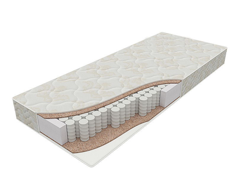 1ст- кокос 10 мм,войлок термоскреп. 2ст- войлок термоскреп. ;кокос 10 мм; чехол — х/б жаккард, пружинный блок — независимые пружины 500 шт/кв.м