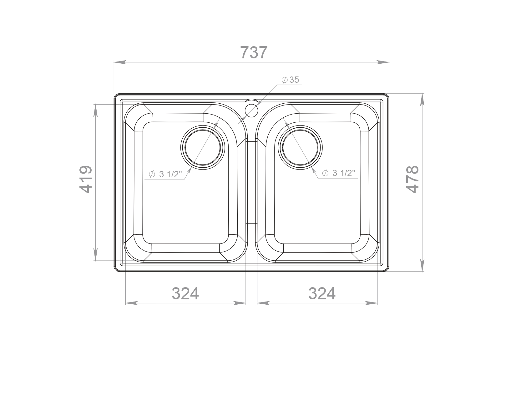 Общий размер мойки: 740х480