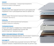 Многослойный матрас, подходящий для пар с разным весом. Многообразие слоев и разность их жесткости обеспечит комфортный сон почти любому. Вязкоэластиный ППУ создает ощущения близкие к материалам с памятью формы, но при этом не увеличивает стоимости самого матраса. Пена с эффектом микромассажа обеспечит полное расслабление после тяжелого дня. В этом матрасе использованы латексированные плиты кокосного волокна и сизаля, имеющие в совокупности толщину 20 мм и 30 мм (разные стороны) обеспечат правильную поддержку позвоночнику и при этом защитят матрас от продавливания. Этот матрас- гарантия хорошего и здорового сна, что в свою очередь пойдет на пользу суставам и опорноднодвигательному аппарату, а в случае уже имеющихся проблем, он поможет замедлить их развитие. Обращаем ваше внимание на то, что любой матрас отвечает за правильность положения во время сна нижнего и среднего отделов позвоночника, а за правильность положения шейного отдела отвечает правильно подобранная ортопедическая подушка. Рекомендуем использование с защитным чехлом AquaStop.