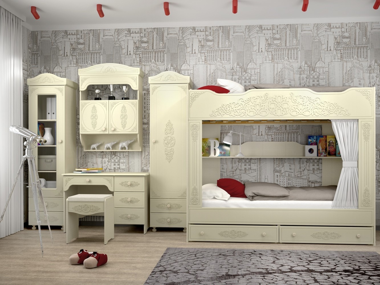 «Ассоль» - мягкий мерцающий глянец и эксклюзивный узор,повторяющийся на фасадах всех модулей идеален для создания нежного уютного интерьера спальни, гостиной, детской, прихожей.