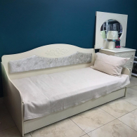 Кровать с мягкой спинкой, выдвижной ящик для белья. Основание кровати выполнено из ДСП. Мебель изготовлена из качественной ламинированной ДСП 16 мм. В оформлении фасадов МДФ применяется уникальная технология нанесения объемного узора (3-D). В цоколи встроены подпятники, предотвращающие повреждение пола.