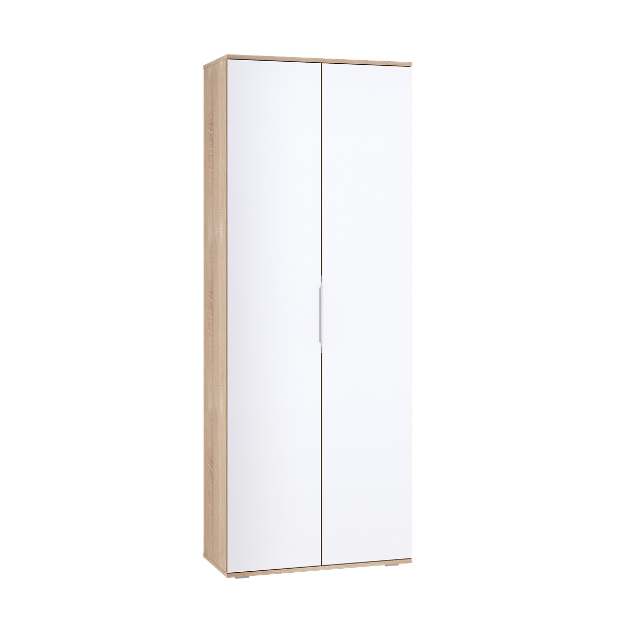 Габаритные размеры шкафа – ширина 90 см, высота 191 и глубина 55 см, позволят разместить его в небольшой прихожей, детской комнате или кабинете. Визуально шкаф можно разделить на два отделения. Большое отделение со штангой для развешивания верхней одежды и секция с тремя вместительными полками. Оба отделения объединены верхней антресолью. Произведен шкаф из современного и качественного материала. Внешняя отделка выполнена в двух оттенках. Цвет корпуса «Дуб Сонома», а фасадные поверхности – в белом цвете.