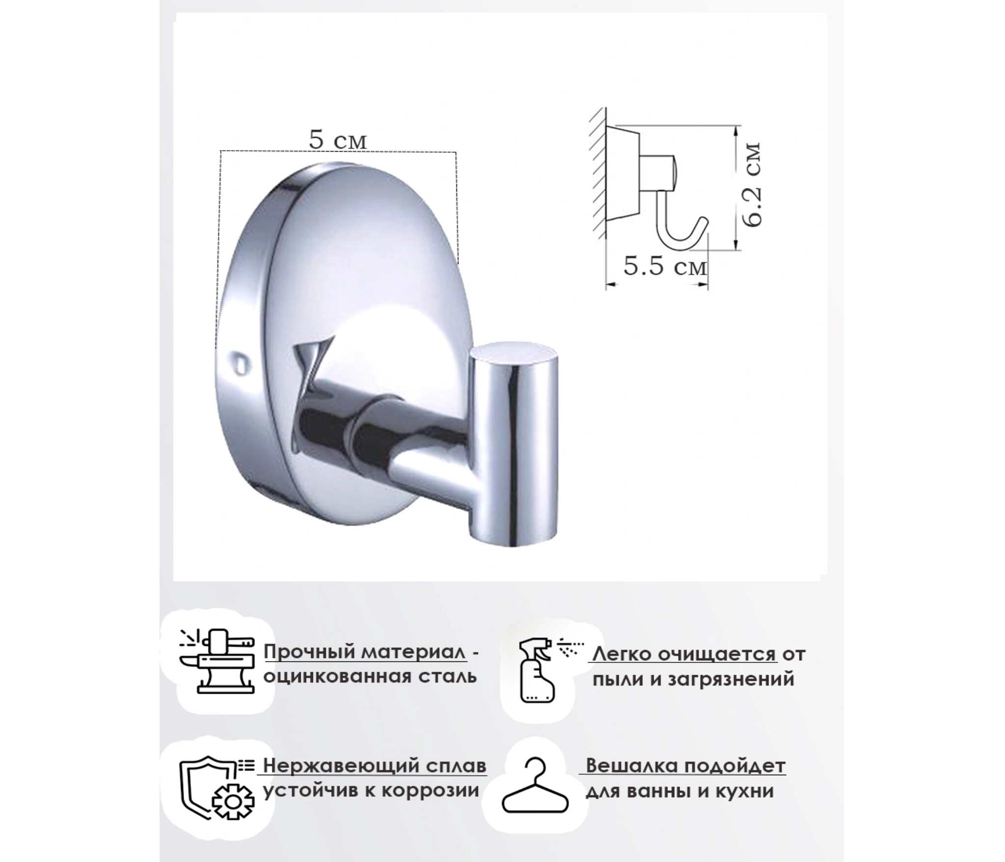 Вешалка изготовлена из материала, устойчивого к постоянному воздействию влаги. Монтаж с помощью сверления надежно зафиксирует аксессуар на любом стенном покрытии. Незаменимый аксессуар для полотенец
