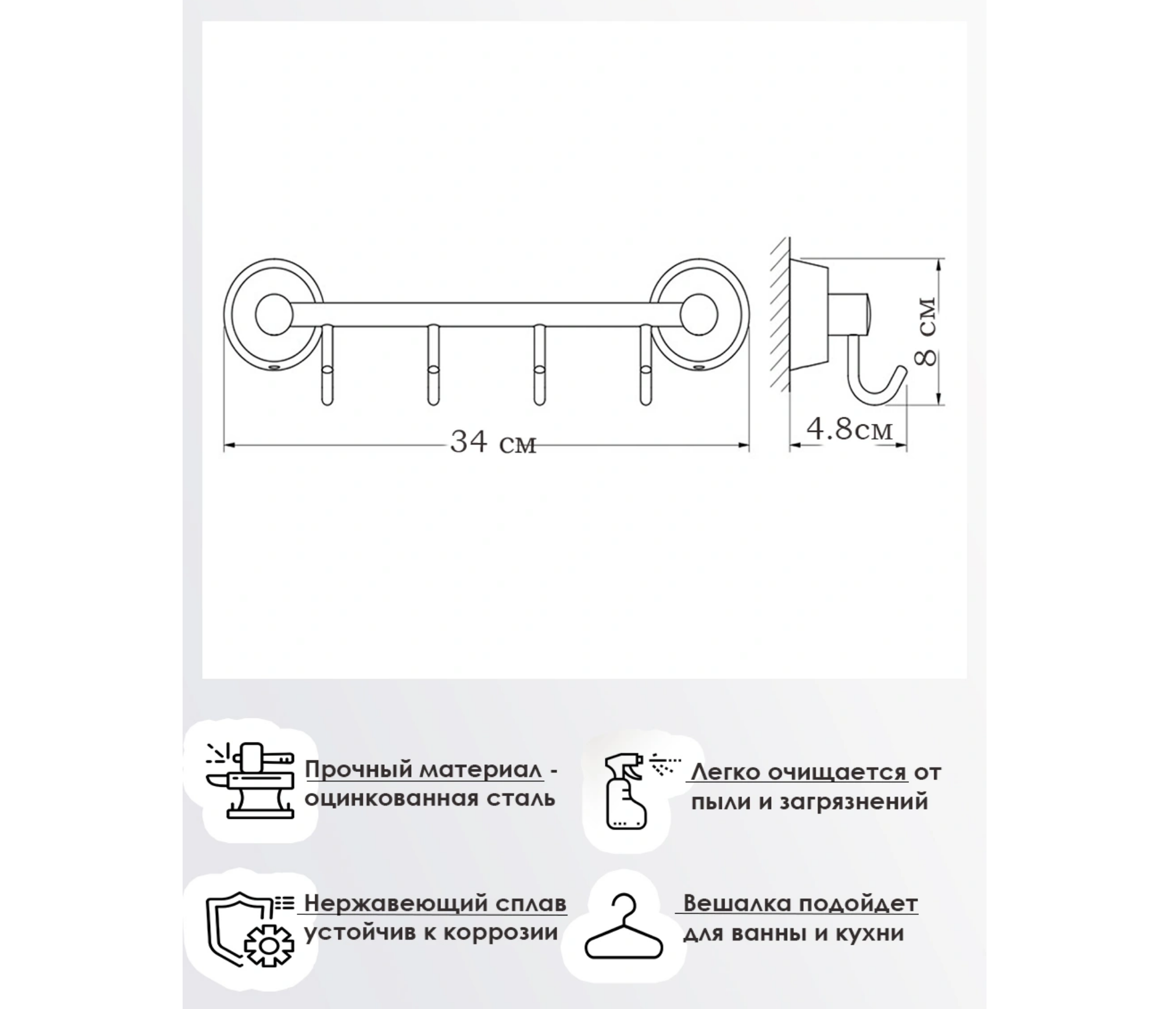 Вешалка изготовлена из материала, устойчивого к постоянному воздействию влаги. Монтаж с помощью сверления надежно зафиксирует аксессуар на любом стенном покрытии. Незаменимый аксессуар для полотенец.