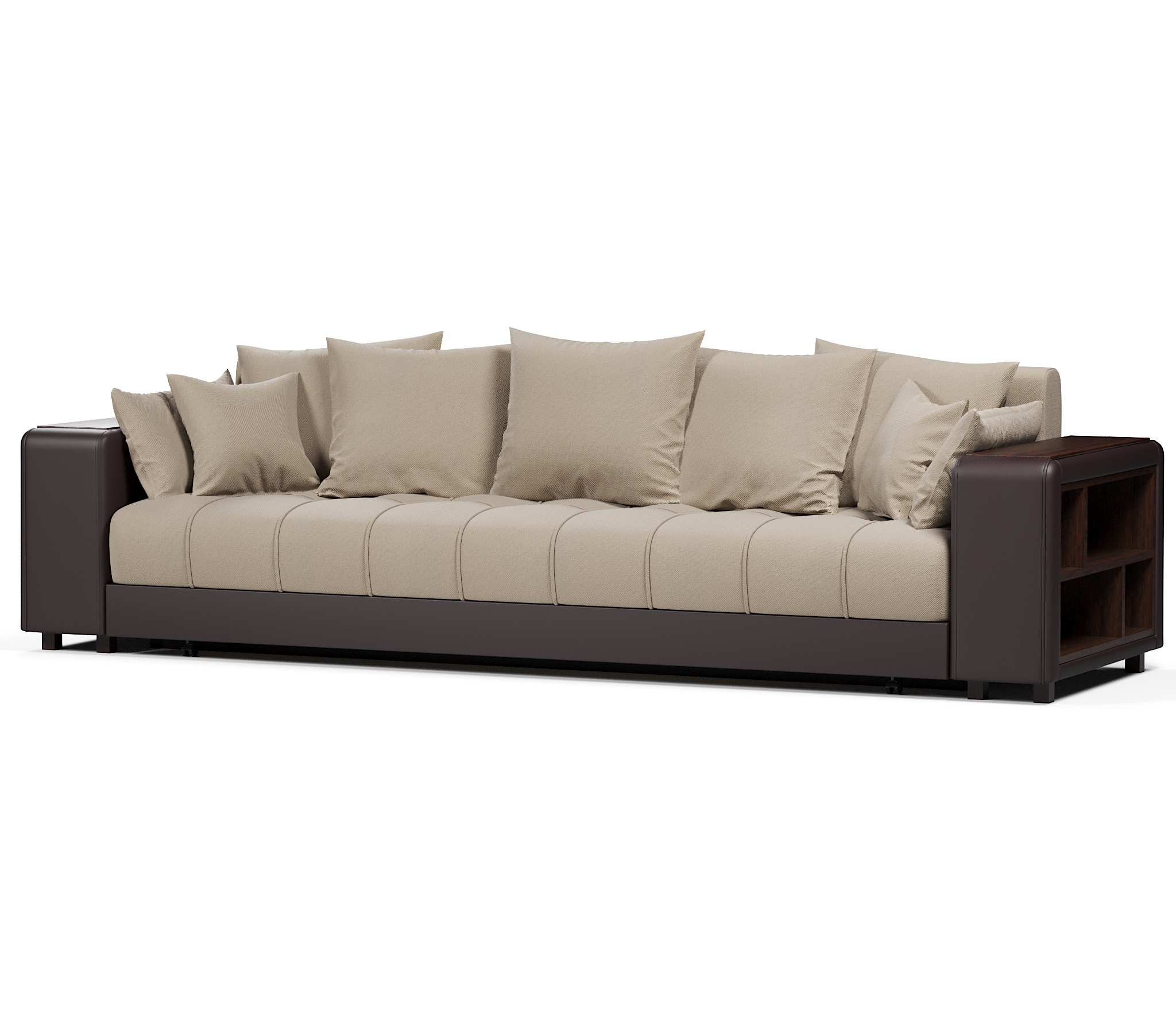 Прямой диван Дубай это отличный выбор для тех, кто планирует создать уют в своей квартире. Модель имеет выдержанный дизайн без элементов, которые перегружают её. С каждой стороны в подлокотниках установлены полки, куда вы сможете складывать различные мелочи, пульт итд.