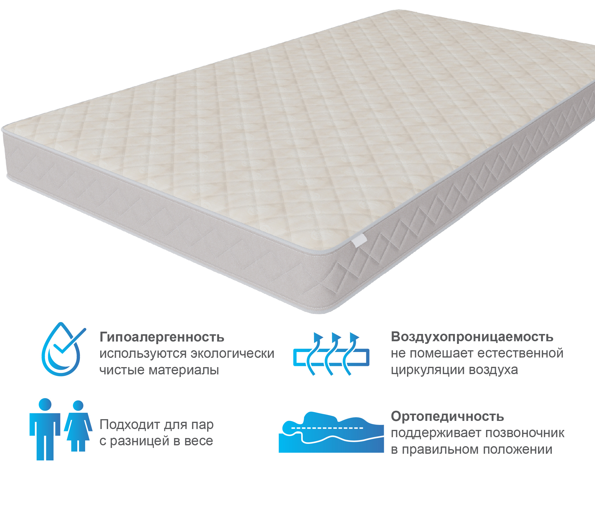 Матрас с ортопедическим эффектом из нашего каталога подходит для двуспальной кровати со спальным местом с широким размерным рядом. Для продления срока эксплуатации и сохранения первоначальных качеств рекомендуем использовать изделие совместно с защитным чехлом.
