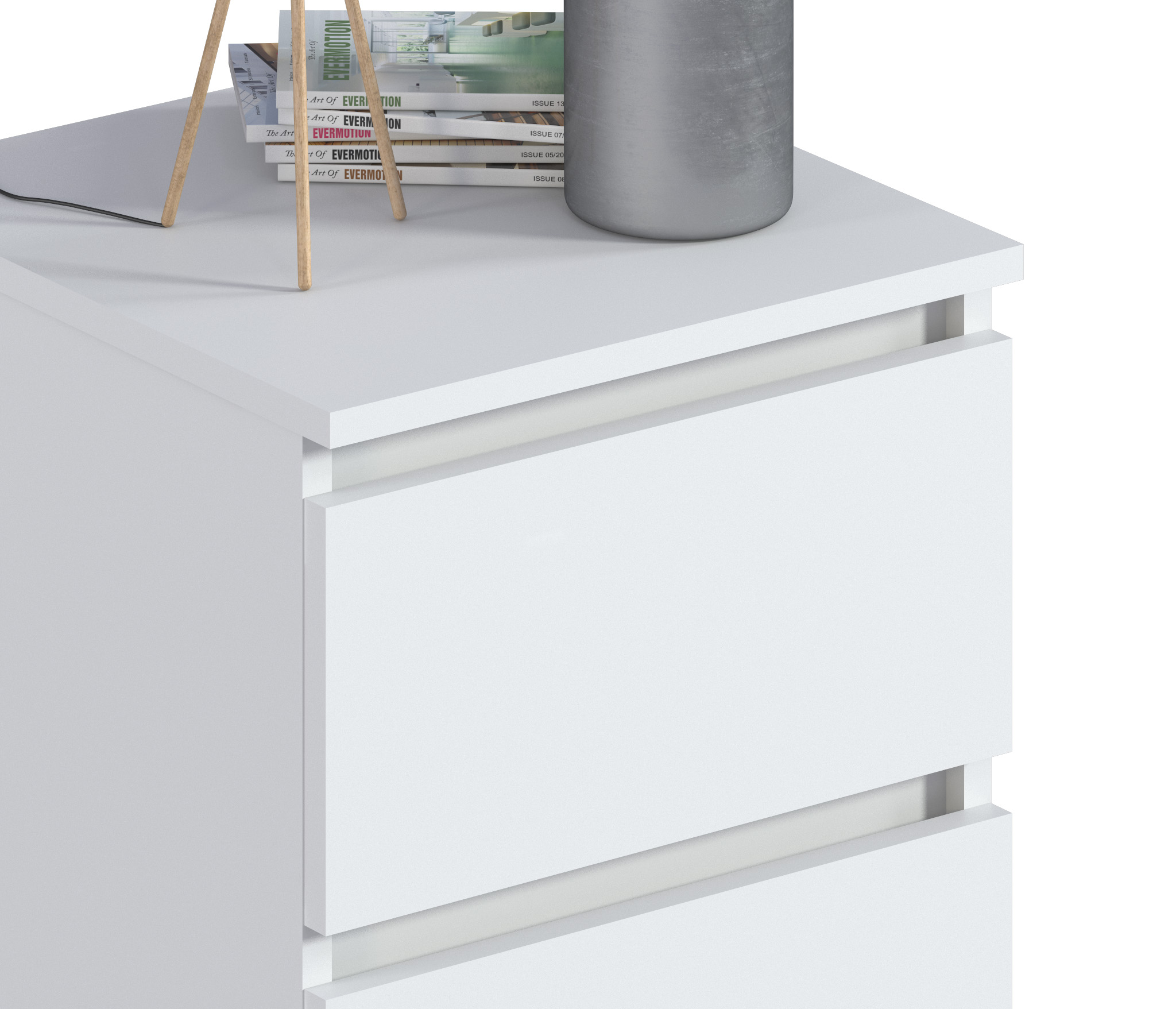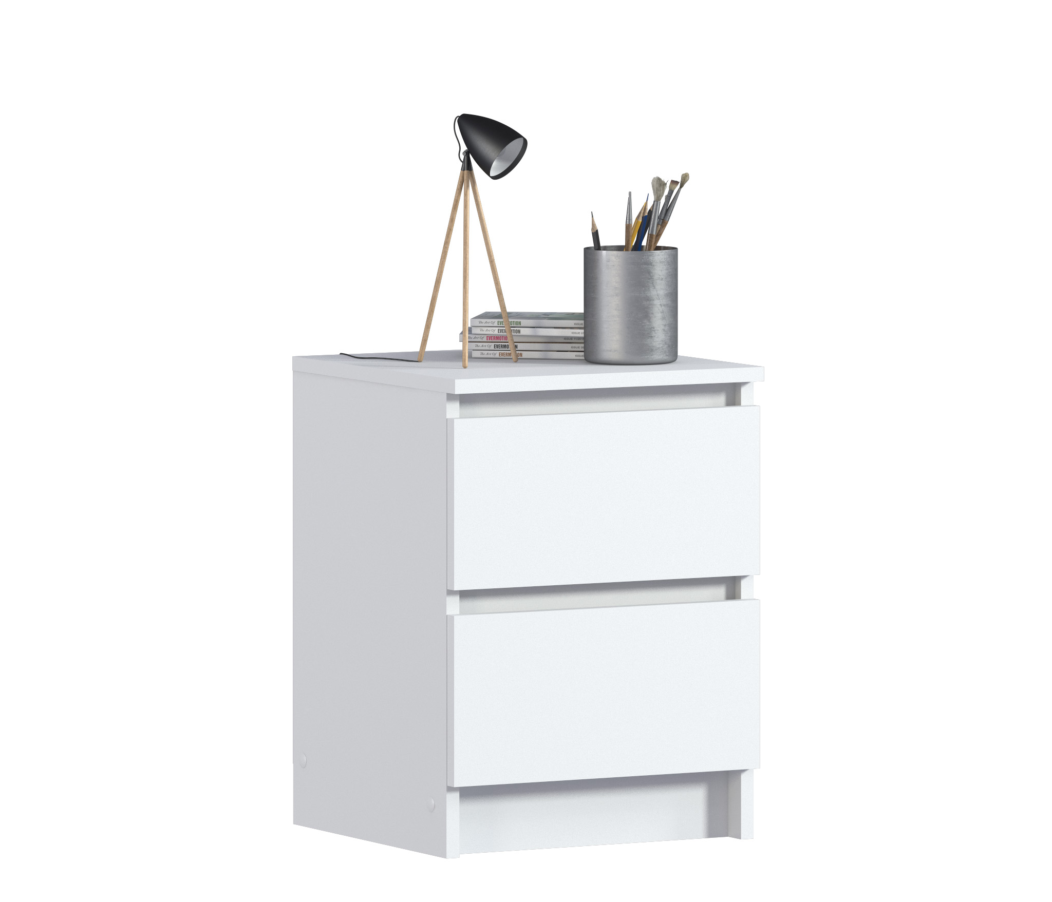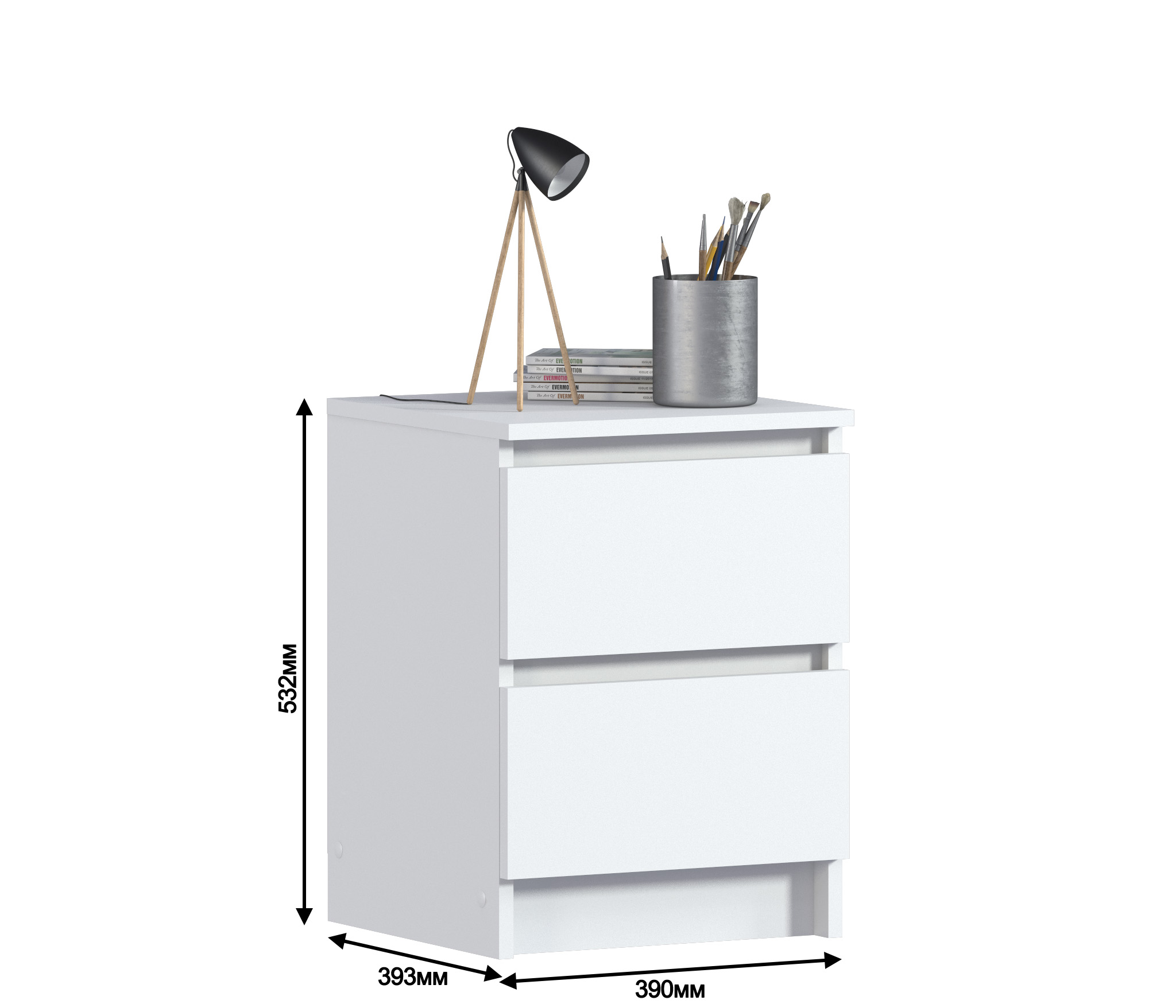 Габаритные размеры тумбы довольно компактны - ширина 39 см, высота 53 см, глубина 39 см. Под столешницей расположены два ящика, оснащенных прочными выдвижными механизмами. Тумба идеально подойдет для оформления вашей спальни или детской в современном стиле. Тумба выполнена из прочного современного КДСП.