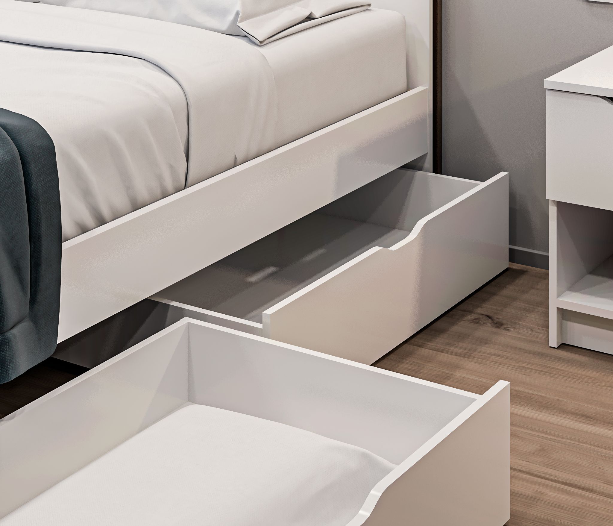 Ящик легко выдвигается и скрывается под кроватью, не занимая лишнего места. Он представляет собой удобное решение для хранения, позволяющее максимально использовать пространство в спальне.