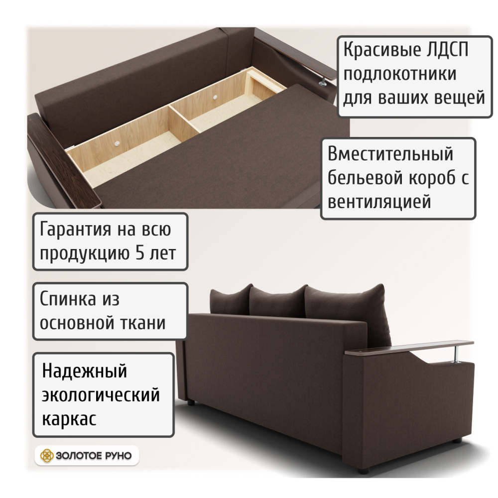 Достоинства: ровное спальное место, лёгкость процесса трансформации дивана, ёмкий бельевой ящик, прочность механизма, долговечность конструкции.