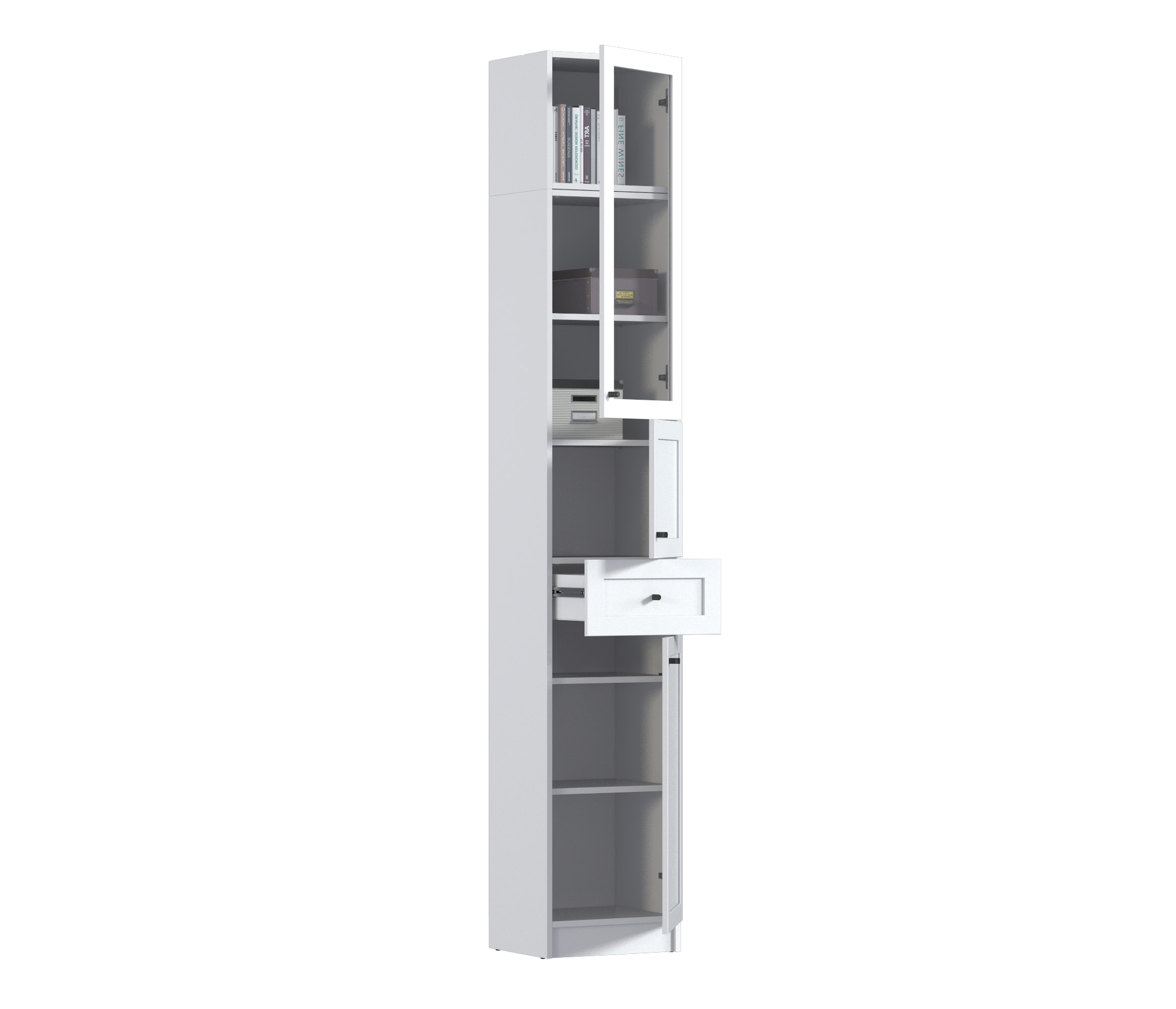 МС Твин предоставляет возможность собрать шкаф или стеллаж по своему вкусу. Вы сами выбираете размеры, цвет ручек: белый или черный, наполнение: ящик или полки. Помимо этого, вы можете решить, оставить фасады глухими или выбрать стеклянные, чтобы добавить прозрачности и легкости в ваш интерьер. Создайте шкаф-стеллаж, который идеально подходит для ваших потребностей и вписывается в ваш стиль.