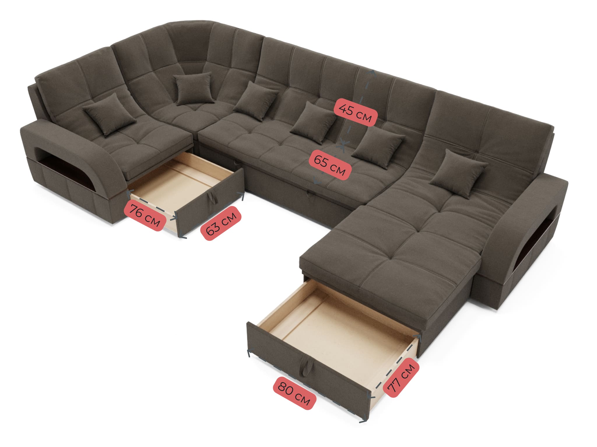 Спальное место имеет ширину 135 см и длину 290 см. Он предназначен для двух человек и имеет глубину сиденья 65 см. Максимальная нагрузка на диван составляет 280 кг.